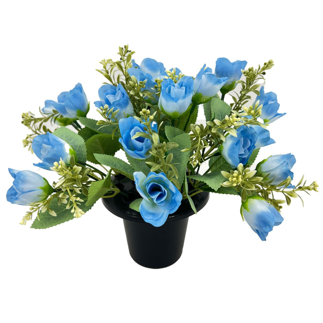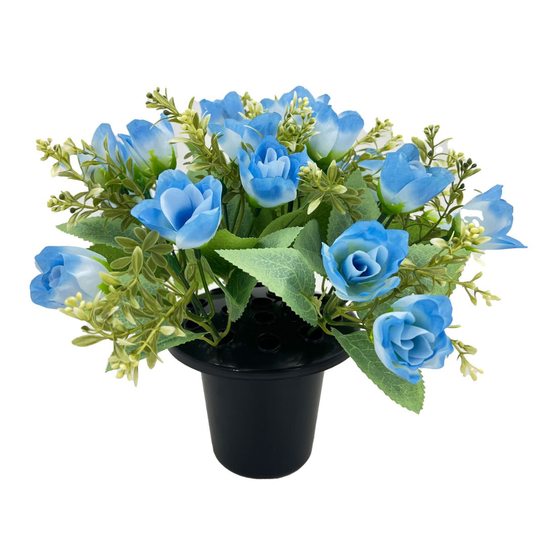 Presented in a classic black pot, this artificial memorial flower display measures 22cm in height and 24cm in diameter, making it an ideal size for gravesites, memorial plots, remembrance gardens, or indoor tribute spaces. Made from high-quality artificial materials, it provides lasting beauty throughout the seasons with no maintenance required.