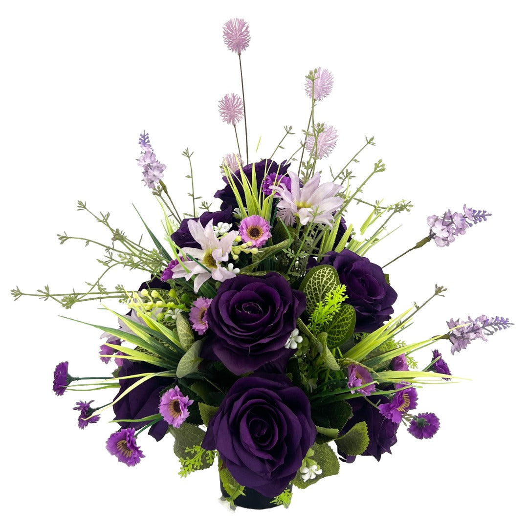 The arrangement features rich purple roses complemented by delicate meadow-style flowers and textured foliage, creating a soft yet elegant tribute. Designed with a flatter back, it sits neatly against a headstone, ensuring a tidy and respectful presentation.