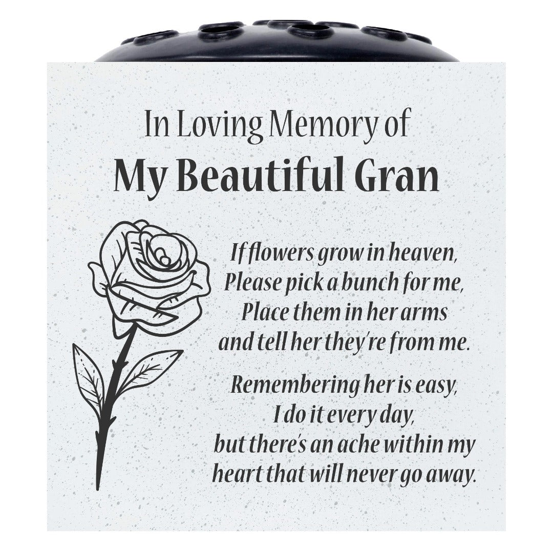 Create a lasting tribute to Gran's memory with this beautifully engraved memorial vase. A simple yet powerful way to express love, remembrance, and devotion.ecurely in place even in outdoor conditions. We also recommend filling the inner plastic vase with water to provide enhanced stability, making it a reliable and lasting option for honoring your loved ones.Please note: Each vase is hand-finished, meaning some minor imperfections are natural, adding to its unique and personal touch.