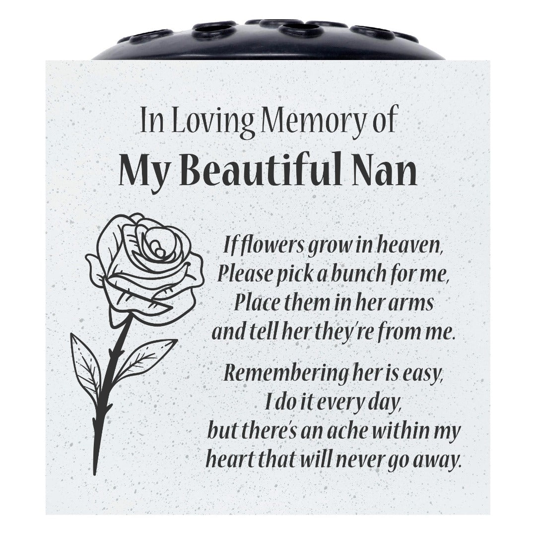 Create a lasting tribute to Nan's memory with this beautifully engraved memorial vase. A simple yet powerful way to express love, remembrance, and devotion.ecurely in place even in outdoor conditions. We also recommend filling the inner plastic vase with water to provide enhanced stability, making it a reliable and lasting option for honoring your loved ones. Please note: Each vase is hand-finished, meaning some minor imperfections are natural, adding to its unique and personal touch.