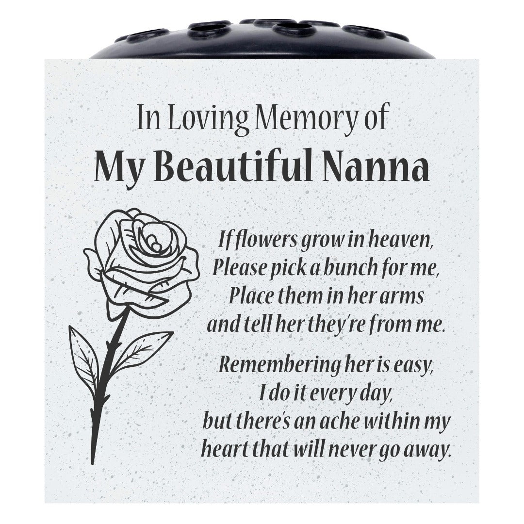 Create a lasting tribute to Nanna's memory with this beautifully engraved memorial vase. A simple yet powerful way to express love, remembrance, and devotion.ecurely in place even in outdoor conditions. We also recommend filling the inner plastic vase with water to provide enhanced stability, making it a reliable and lasting option for honoring your loved ones. Please note: Each vase is hand-finished, meaning some minor imperfections are natural, adding to its unique and personal touch.