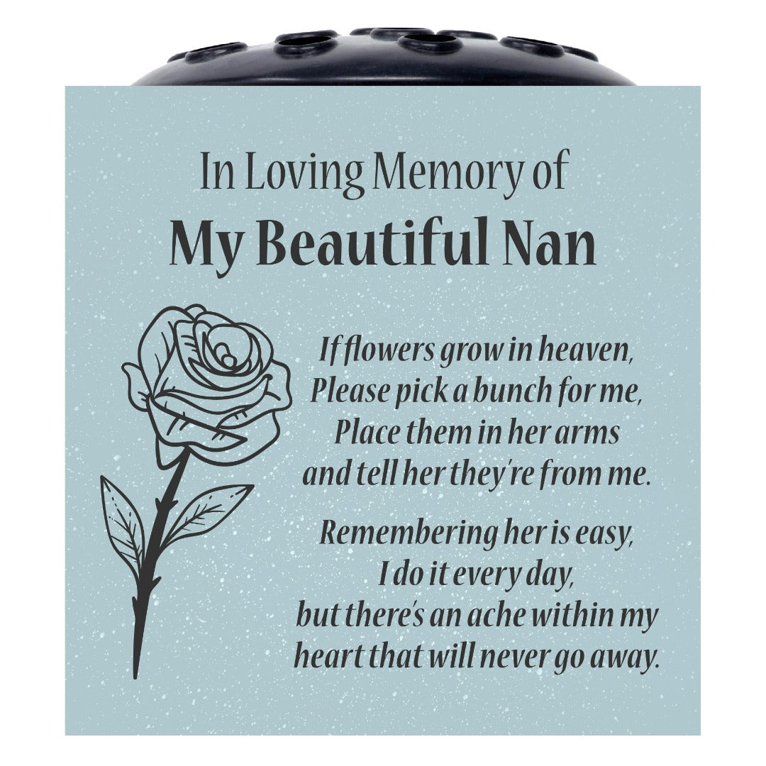 Create a lasting tribute to Nan's memory with this beautifully engraved memorial vase. A simple yet powerful way to express love, remembrance, and devotion.ecurely in place even in outdoor conditions. We also recommend filling the inner plastic vase with water to provide enhanced stability, making it a reliable and lasting option for honoring your loved ones. Please note: Each vase is hand-finished, meaning some minor imperfections are natural, adding to its unique and personal touch.