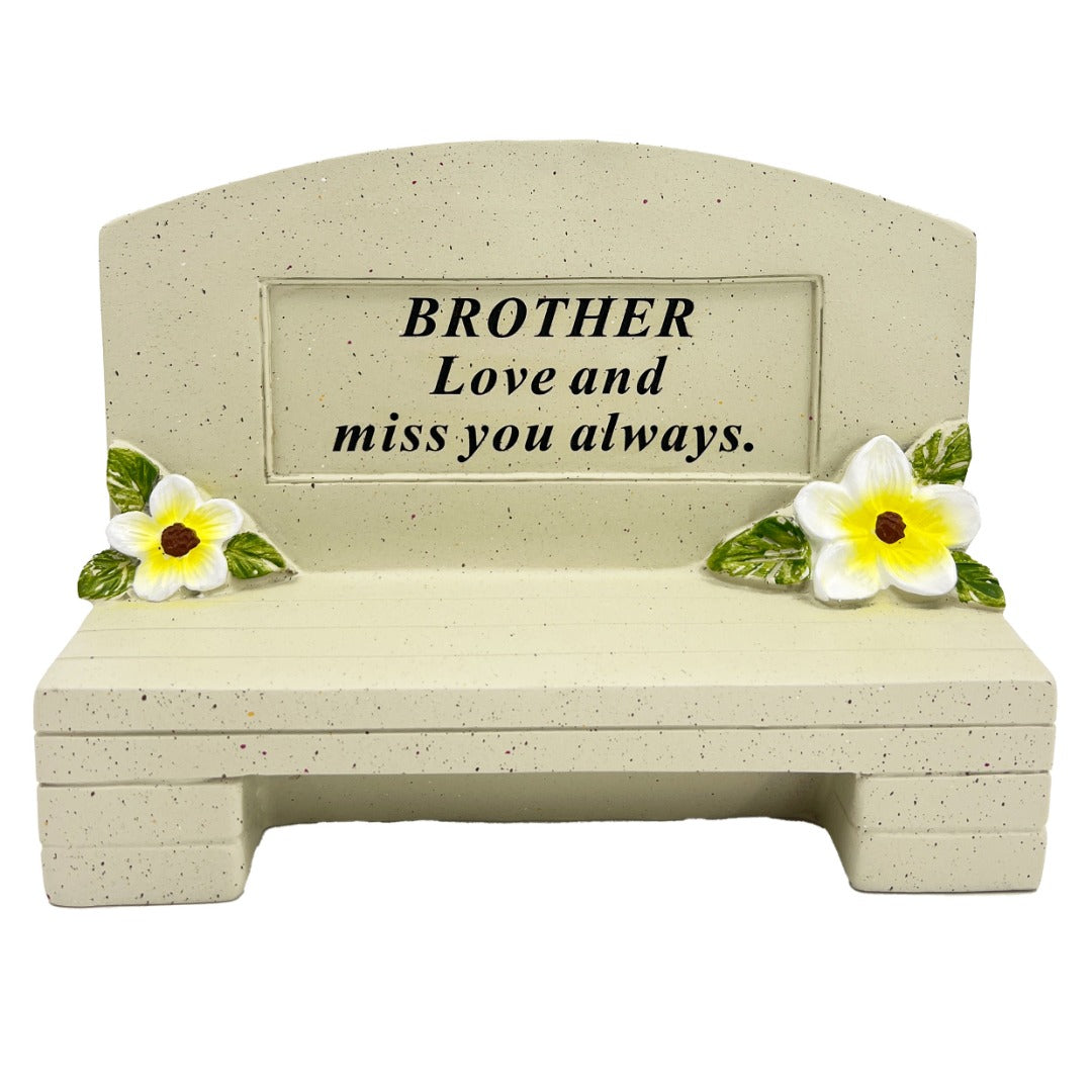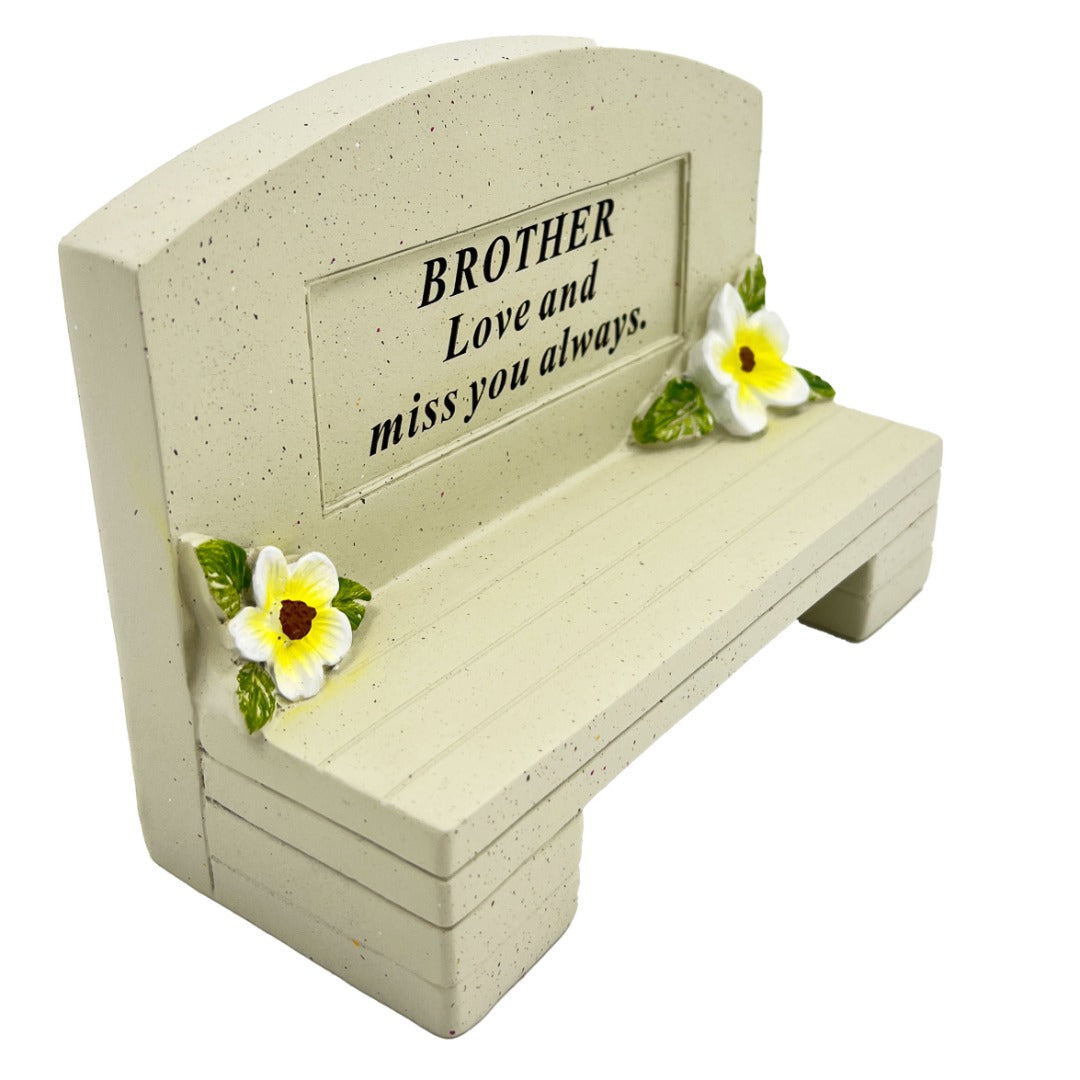 - A beautiful memorial ornament plaque in the design of a bench, adorned with pretty white flowers. The ornament reads;