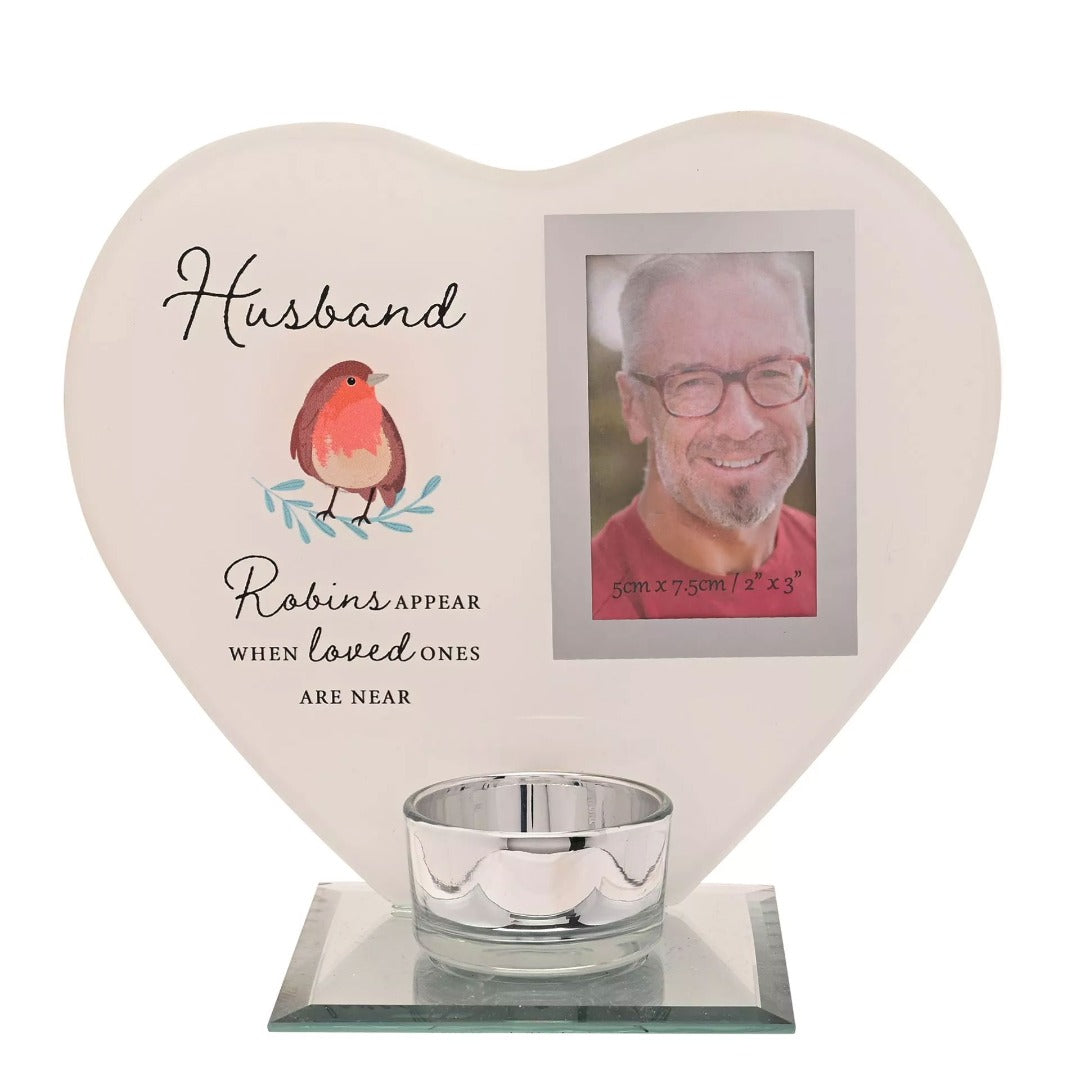 Create a beautiful tribute to a cherished Husband with this elegant glass memorial photo frame. Designed in a heart shape with a mirrored glass base, this touching keepsake features a delicate robin illustration and the comforting words: